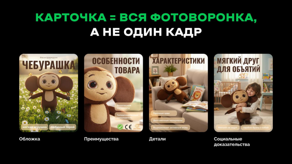 «Карточка — это не один слайд товара, это вся фотоворонка. Покупатель всё чаще не просто смотрит обложку, а пролистывает второй, третий, четвёртый слайд. Он оценивает цепочку целиком. Поэтому карточка — это набор кадров, который ведёт человека по воронке, а не одна-единственная картинка.»