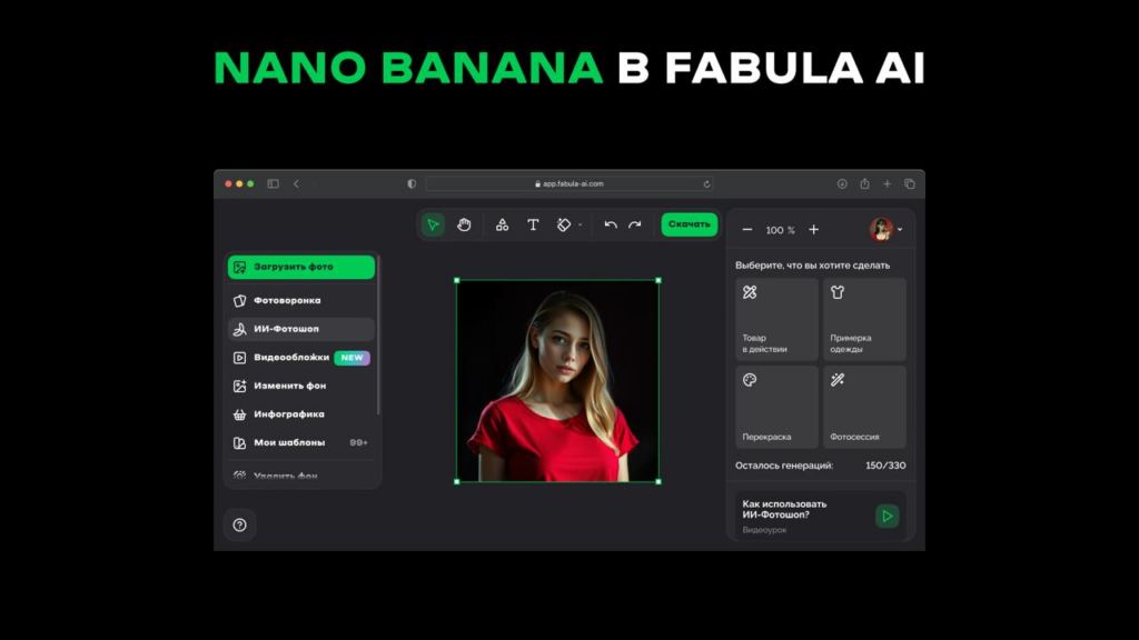 В Fabula AI этот движок встроен прямо в продукт: ИИ-фотошоп в Фабуле — это Nano Banana, упакованная в интерфейс сервиса. Все привычные сценарии работы уже собраны в одном инструменте, без ботов, сторонних сайтов и лишних шагов.