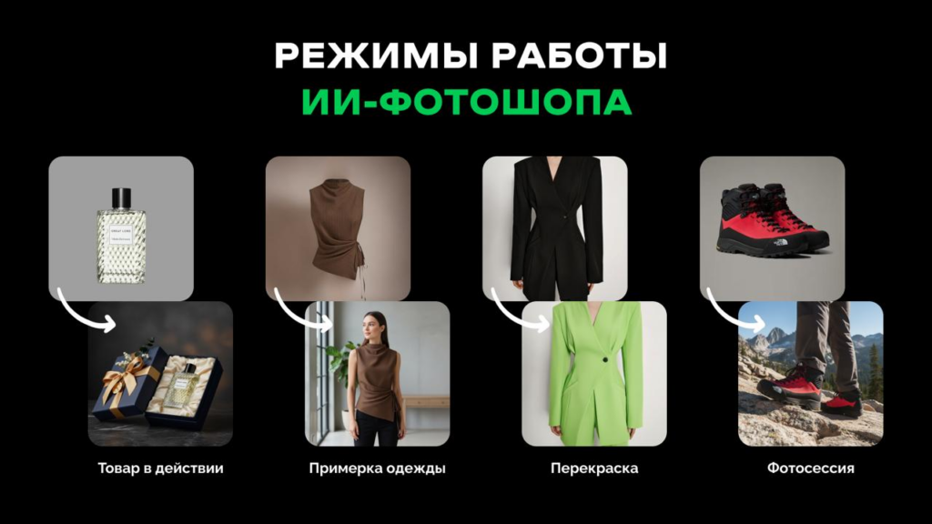 - безлимитный доступ к нейросетям для задач вроде изменения фона, ИИ-инфографики, улучшения фото, генерации картинок по тексту, замены лица, визуала для фотоворонок,